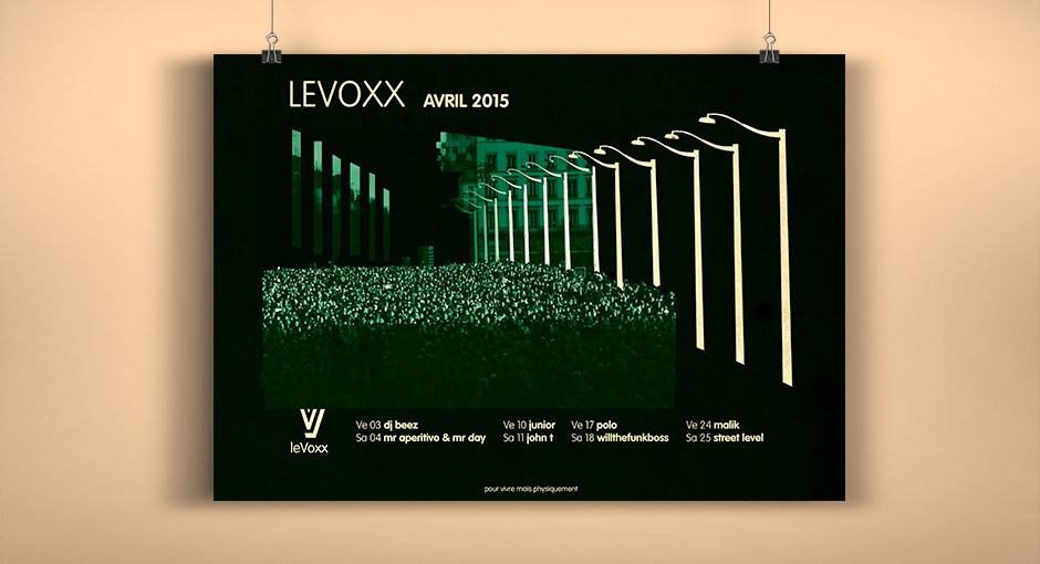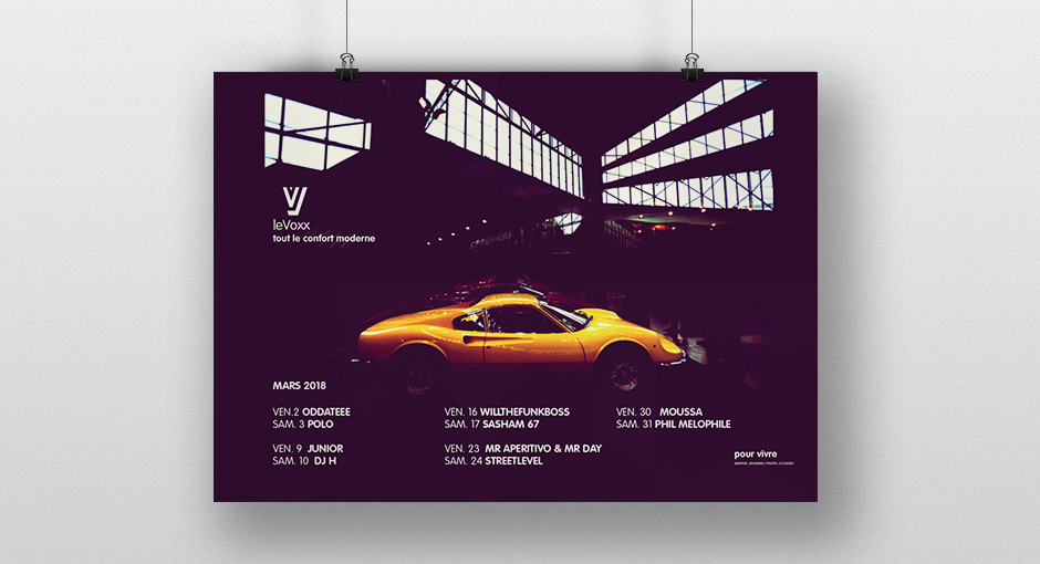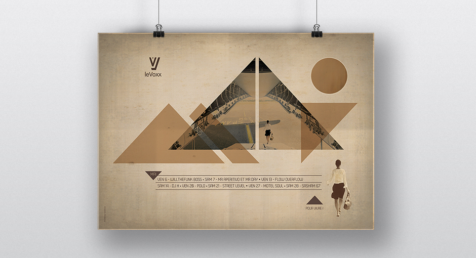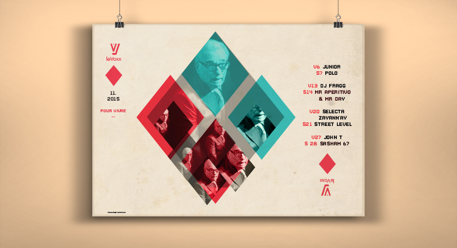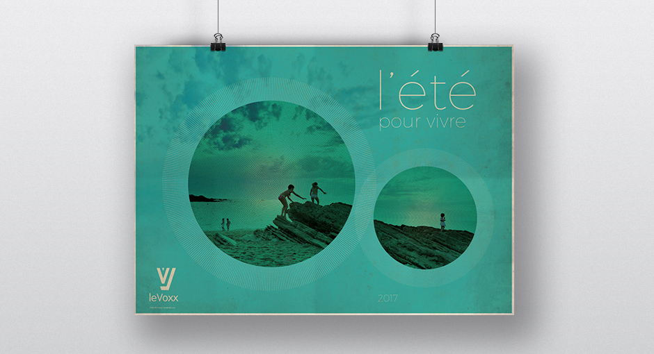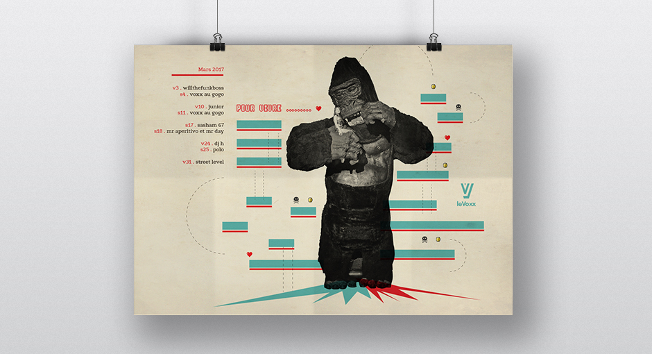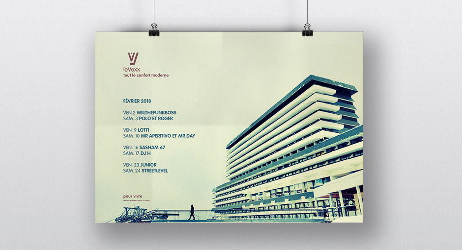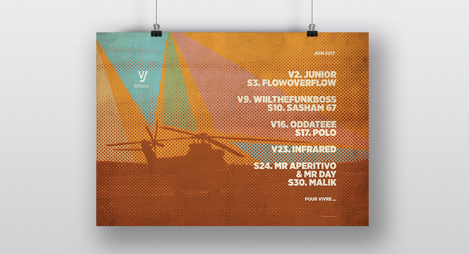 Les créations mensuelles d'affiches originales pour la programmation du Voxx s'élaborent comme des jeux graphiques inspirés des photos fournies par le photographe Olivier Chassignol