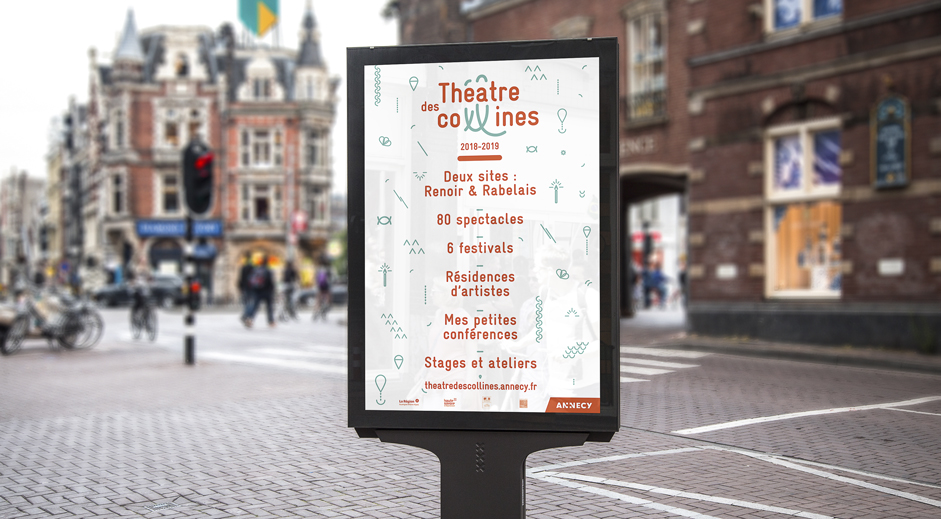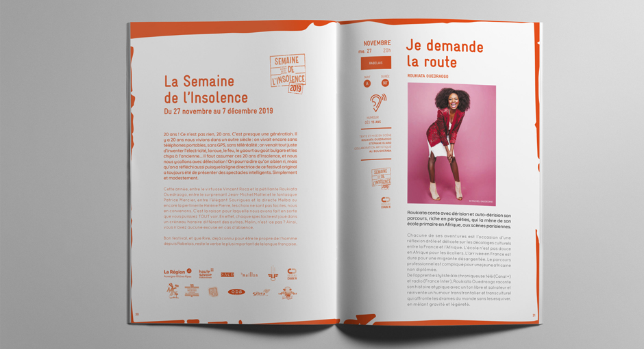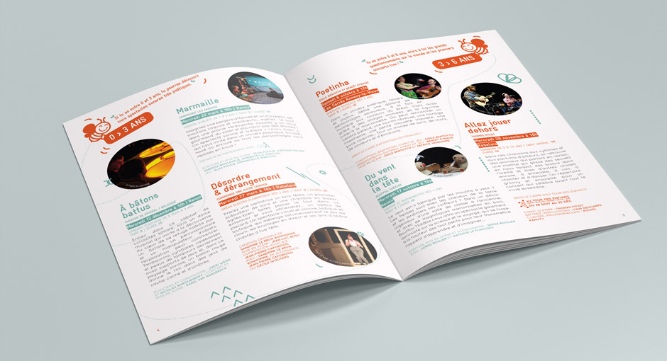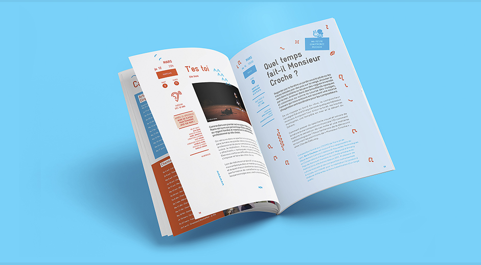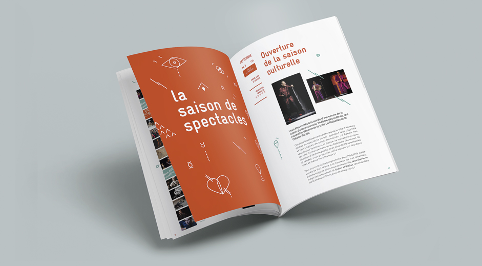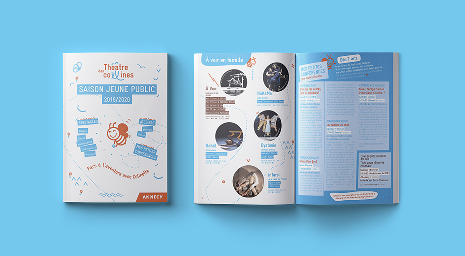 Identité visuelle, création des visuels de saison, créations de maquette, mise page, éditions des plaquettes de saison, et autres outils de communication, signalétique, affiches, encarts presses, goodies..